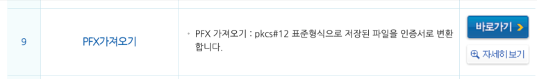 파일 변환 준비 및 프로그램 설치한국전자인증 사이트 접속 (https://www.crosscert.com/glca/01_3_044.jsp)사이트 접속 후, 보안 프로그램 설치 안내가 나오면 화면의 지시에 따라 설치를 진행합니다.설치가 완료되면 9번 PFX 가져오기 우측에 [바로가기] 버튼을 클릭합니다.4. 인증서 가져오기 버튼을 클릭합니다. (목록에 나오는 인증서들은 무시합니다.)5. .pfx 또는 .p12 확장자를 가진 인증서 파일을 업로드 합니다.6. 인증서 비밀번호를 입력합니다.7. 저장 매체를 선택합니다. 이 예시는 ‘하드 디스크’ 를 선택하겠습니다.8. 변환이 완료 되었으면, NPKI > SignKorea > User 폴더에 인증서가 생성됩니다.