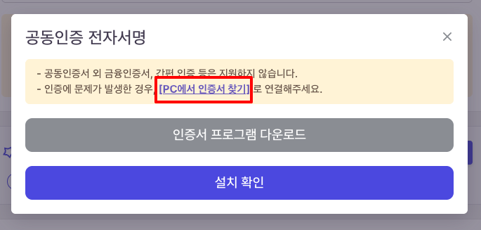 • 화면에 있는 'PC에서 인증서 찾기' 버튼을 클릭하세요.